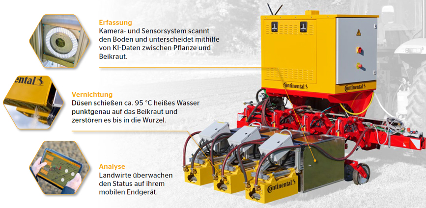Ein auf dem Anbaugerät montiertes Kamera- und Sensorsystem scannt den Boden kontinuierlich während der Fahrt. Mithilfe von KI erfasst das System Beikraut – und vernichtet es sofort. Dazu schießen bis zu 21 Düsen ca. 95 °C heißes Wasser punktgenau auf die Pflanze und zerstören sie bis in die Wurzel. Der Prozess kann über ein digitales Dashboard überwacht und analysiert werden.