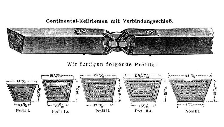 Continental drive belts were groundbreaking for the automotive and industrial sectors at the time. Registration under the brand name Continental – including for drive belts – dates back to 1899. Initially, only belts for industry were produced. From 1907 on, the first V-belts for motorcycles were added. The catch: the drive belts were still finite, that is, they we re connected by a lock.