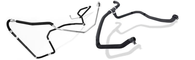 The weight of the new hose generation has also been reduced. Smaller line cross-sections on the high-pressure side and in the battery cooling line help to ensure that as little refrigerant as possible has to be used. The right mixture of rubber, polyamide and aluminum materials and an ingenious line geometry ensure the system has adequate inherent stability. The hose developers succeeded in reducing the weight of the oil cooling line by 25 percent, while improving its under- and overpressure resistance by 50 percent at the same time.