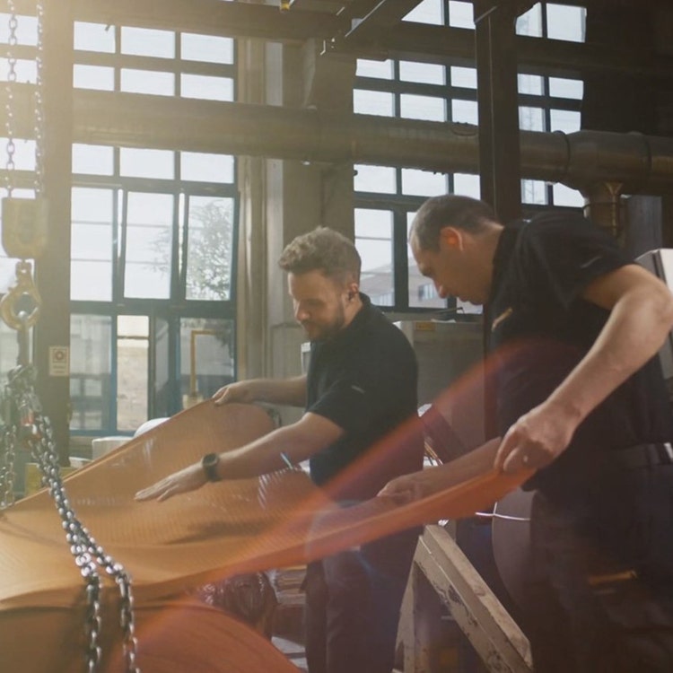 Two men in black shirts work together inside a sunlit industrial workshop, inspecting or handling a large orange sheet of material on a machine, with chains and equipment visible around them.