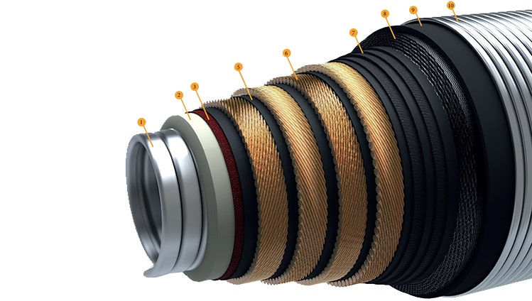 Bonded flexible hoses used in subsea production, gas & water injection, gas lift, gas export, oil transfer and firewater service. Built according to the API 17K standard.