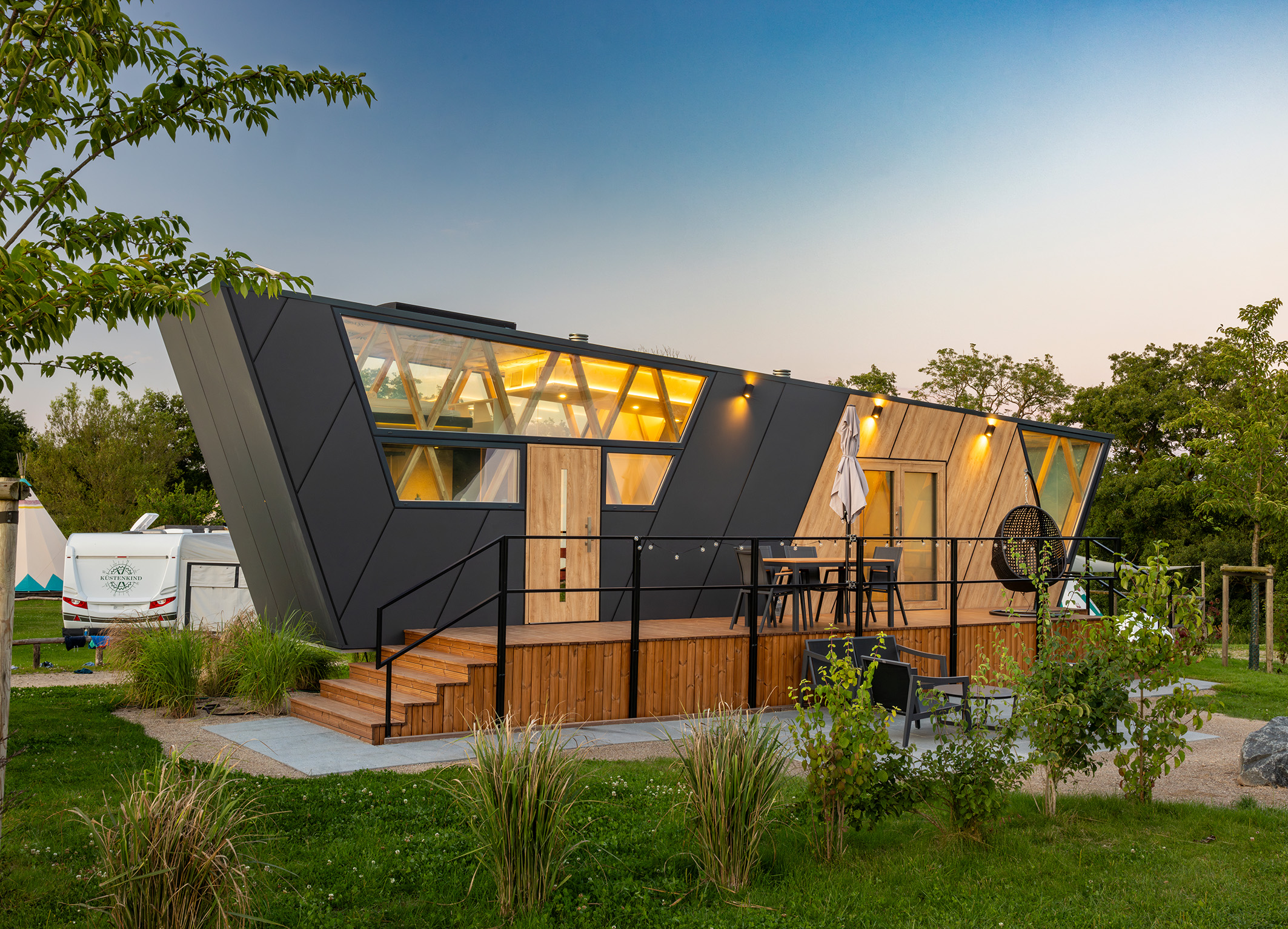 The first ContiHome is located on the northern German glampsite run by provider George Glamp on Lake Belau between Kiel and Lübeck. Glamping is a more luxurious form of camping that involves unusual types of accommodation in the midst of nature. Combining the idea of a motorhome or caravan on the one hand and a hotel or vacation apartment on the other, the Continental tiny house fits right into this concept.