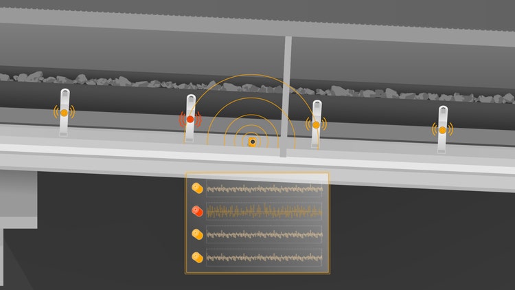 Continuous maintenance in covered sections or underground conveyors, on the other hand, is carried out using fixed microphones installed every 20 to 25 meters that capture frequency variations in the numerous idlers. The audio recording is conducted twice a day, with the data being uploaded to the cloud specified above. Events that indicate a damaged idler are then investigated using an AI-based algorithm.